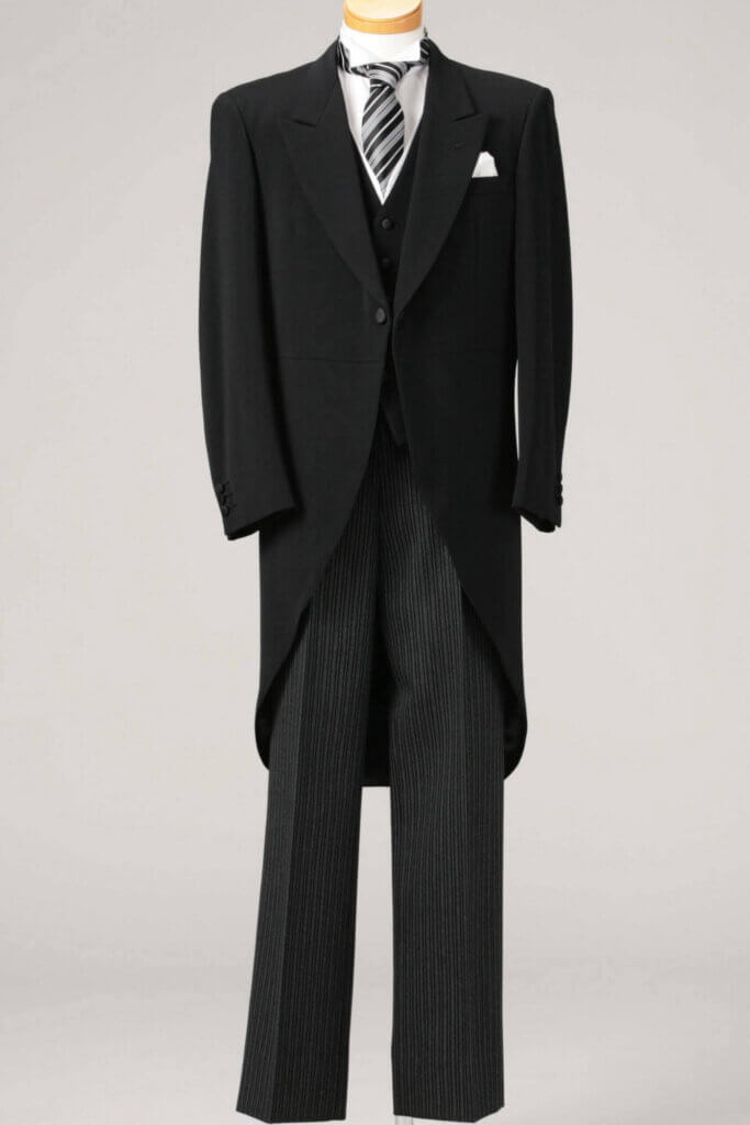 モーニングジャケット・スラックス・ベスト・シャツ・ネクタイ・ポケットチーフ・